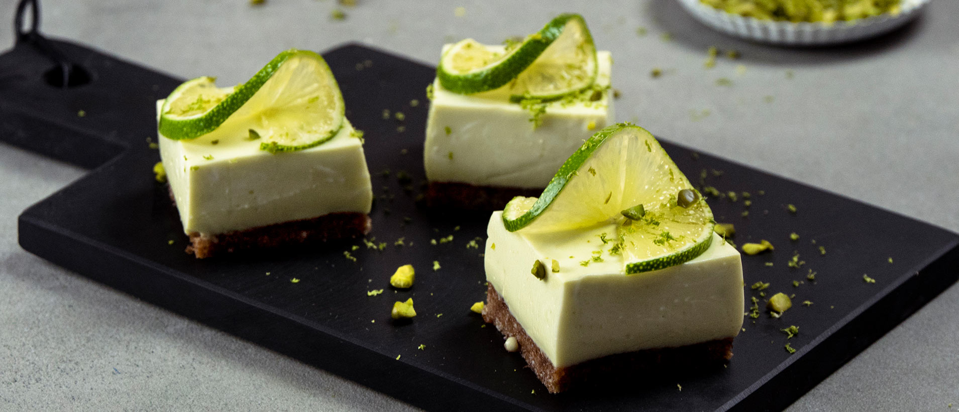 Die Gelatine in einem kleinen Topf mit 150ml kaltem Wasser quellen lassen und zur Seite stellen. Die Datteln und die Mandeln, gemeinsam mit der weichen GAZİ Butter in einem Zerkleinerer oder mit einem leistungsstarken Standmixer zerkleinern und gut durchmischen. Die Mischung auf die mit Backpapier ausgelegte Backform gleichmäßig verteilen und fest darin andrücken. Limetten gut waschen und Schale abreiben bzw. Zesten abreißen. Den Saft auspressen und beiseitestellen. Die Avocado schälen und zusammen mit dem Limettensaft fein pürieren, bis eine gleichmäßige Masse entsteht. In einer großen Schüssel den GAZİ Frischkäse mit dem GAZİ Joghurt gut verrühren. Den Topf mit der Gelatine nehmen und mit dem Zucker unter Rühren so lange erwärmen, bis sich Zucker und Gelatine vollständig aufgelöst haben und unter die Joghurt-Frischkäsecreme rühren. Den Limettensirup dazugeben. Avocadmus dazugeben und alles gut miteinander vermengen. Die Creme in die Form füllen und für 3 Stunden in den Kühlschrank stellen. Vor dem Servieren mit Limettenscheiben, Zesten und gehackten Pistazien garnieren.