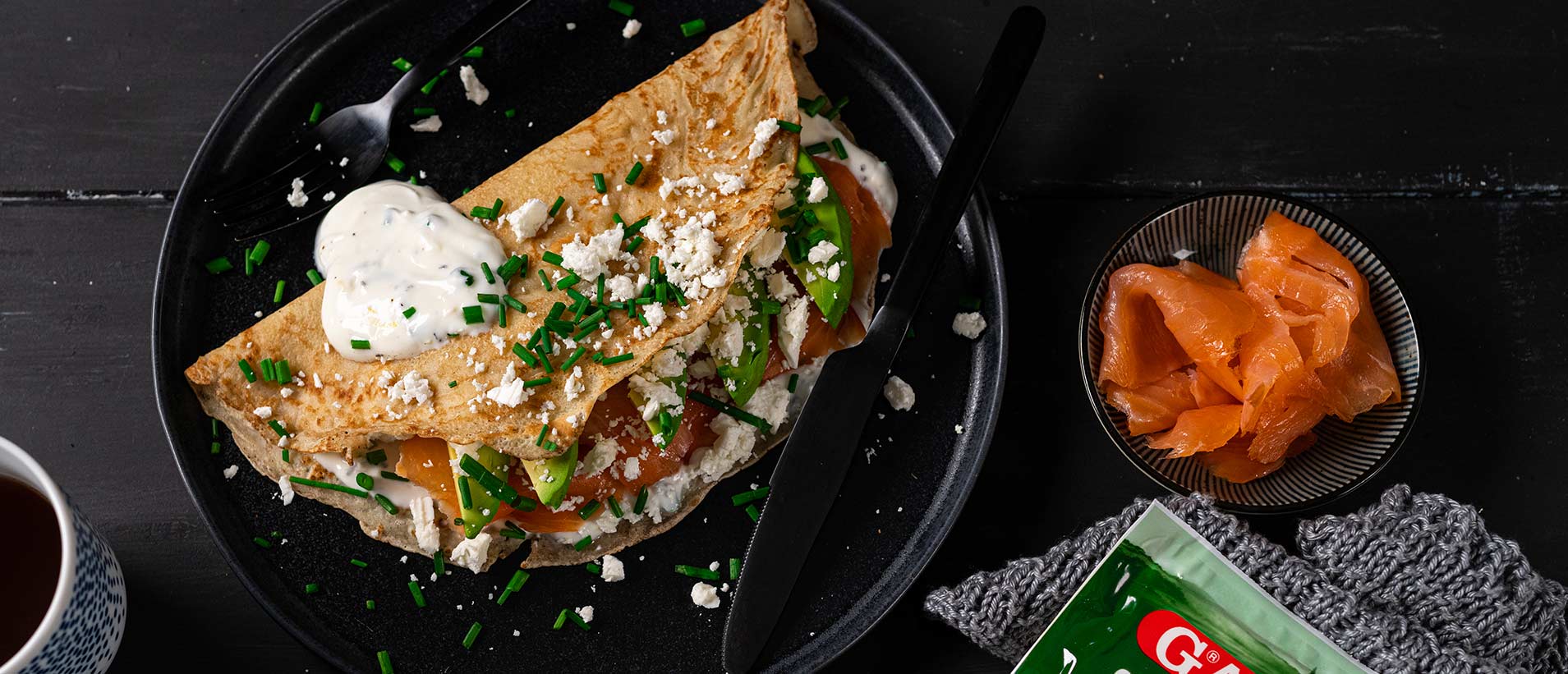 Aus den Eiern, Milch, Mehl und Salz den Pfannkuchenteig anrühren. Etwas Butter in einer Pfanne zergehen lassen und die Pfannkuchen darin nacheinander ausbacken. Den Naturjoghurt mit Schnittlauch, Salz, Pfeffer, Zitronenabrieb anrühren. Einen Pfannkuchen mit Joghurt halb bestreichen, mit Räucherlachs, Avocadostreifen und Schafkäse belegen und zuklappen.
